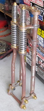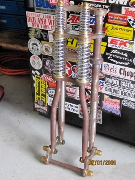 IMG_0607 These custom built springer front ends (built exclusively for Guilty Customs) are already getting to be the “talk of the town” because of their craftsmanship and price. Each one is TIG welded using only the highest quality metals and components.  These  springer front-ends embodies the spirit of the industry’s original springers by using original HD springs with inner helper springs, choice of custom milled brass/stainless bushings and brass/stainless fittings, and state of the art technology for one of the industry’s highest quality and most reliable front-ends.