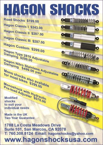 Hagon Shocks, a British shock manufacturer established in 1958, has opened their doors in North America for the first time.  “This is a new endeavor for our company and a very exciting time for us all,” said owner Martin Hagon.  “We have a quality product that fits into the vast American motorcycling market. We have shocks for over 1,300 different makes and models of motorcycles, so we can accommodate almost anybody.”