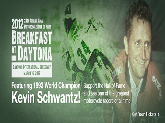 The AMA Motorcycle Hall of Fame is pleased to announce that 1993 World Roadracing Champion Kevin Schwantz will be the featured guest at its annual Breakfast at Daytona fundraiser, set for the Friday of Bike Week, March 16, at the Daytona 500 Club in the infield of Daytona International Speedway.