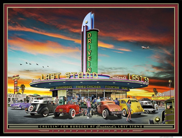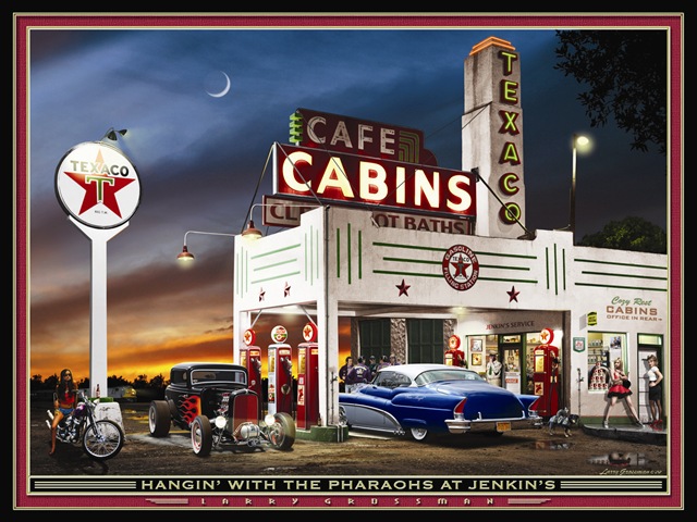Artist Larry Grossman’s amazingly detailed new print “HANGIN’ WITH THE PHARAOHS AT JENKIN’S” has it all …a rod, a kustom, a bitchin bike, and a bunch of babes, all at a classic Texaco station! This exciting picture will definitely take you back and blow you away! Not only that, Larry also offers the option of creating customs picture whereby he’ll put your car(s) and/or bike(s) and you (or whoever) into any of his scenes …now how cool is that! Larry’s art is quite diverse, and also includes pictures of vintage Trains, Planes, Diners, Movie Theatres and more. You can see and buy all of his work on his nifty Retrovisions website. Priced at only $30 for any of his high quality 19×25″ prints, how can you lose …in fact, for another five bucks he’ll even sign and date it for you in gold ink! . Catch an exciting look into Grossman’s world at www.retrovisions.com. Studio contact between 10-5 Pacific Standard time 818-907-8626.