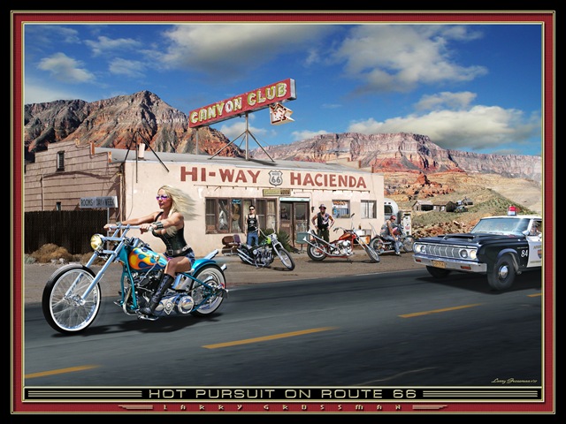 Be sure to go to his web site. www.retrovisions.com. The girl riding the motorcycle in the Hot Pursuit image attached was actually sitting on a park bench in Huntington wearing Levis, tennis shoes and no glasses. The bike was a ragged black chopper being unloaded from a truck in Van Nuys. The building was some deserted old shop from the mid west and the mountains are in the high desert.