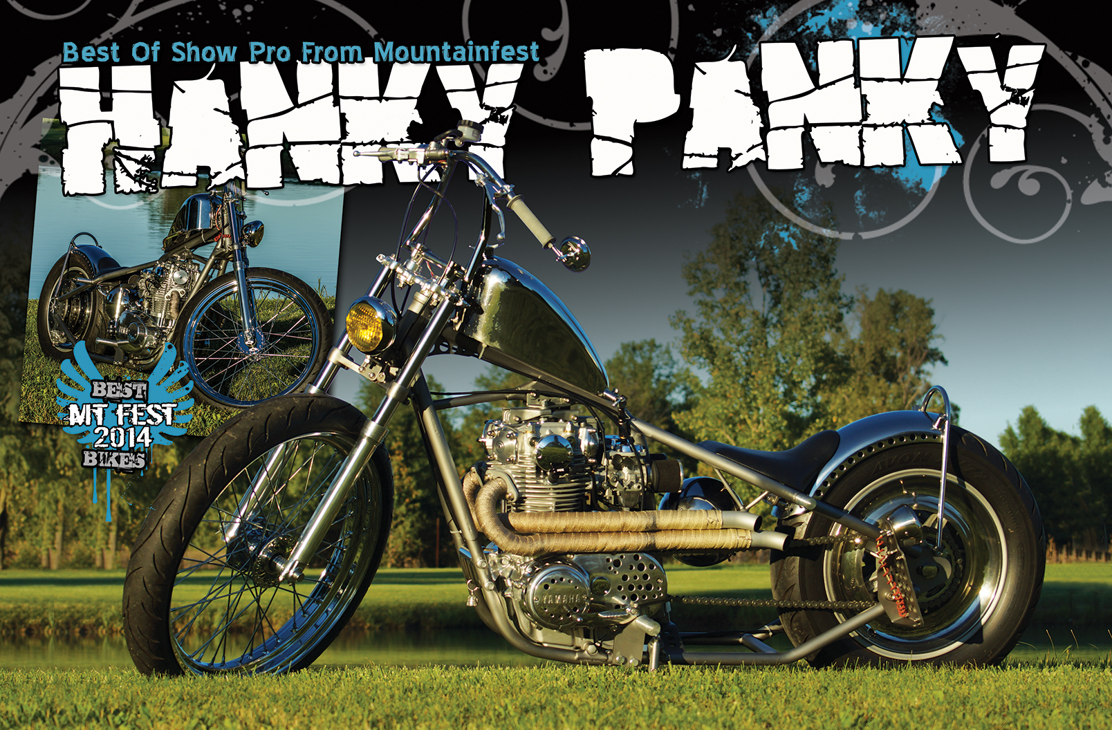 With things coming together Daniel fabbed up a gas tank with a Moon Eyes cap. A Led Sled fender was cut down to cover the rear tire, held in place by a sissy bar bent up by Daniels friend Big John. A Pandemonium E-Bomb tank was then added to hide all the electric components. Daniel contacted Jay at Jump Street Customs in Michigan to weld up the handle bars. As it started to take physical shape Daniel began adding personal touches. He grooved and stepped the valve covers, and bungs. Speed holes were then drilled in the rear fender and the clutch cover. Daniel then machined off the square corners of the engine fins to give a smooth round appearance. As the project neared its end it was time for Daniel to decide on a finish. A natural finish was decided upon with items like the frame and engine being glass bead blasted. Joe Schindler, brother of Daniels girl Kerri, then put the shine on parts like the gas tank, fender, and E-Bomb tank. It needs to be noted that this was Joe’s first time polishing, take a look at that shine. So, are you wondering where the name “Hanky Panky” came from? Well, personal bikes get worked on when the customer’s bikes are done. Seems this one kept calling Daniel away from the customer rides to work on her. Getting into a little “Hanky Panky” in the shop. With the help of friends and family Daniel was finally able to get back in the seat of his own bike once again. Hanky Panky was finished up in time for Mt. Fest in West Virginia where Daniel took it out on its first shake down run and then entered it in the bike show, where it justifiably won Best of Show. It also recently took an award at Hogs and Heifers during Vegas bike week. So, if you happen to see Daniel riding a bike with a shine so bright all you can see is a giant smile then you’ll know he is up to a little “Hanky Panky”.