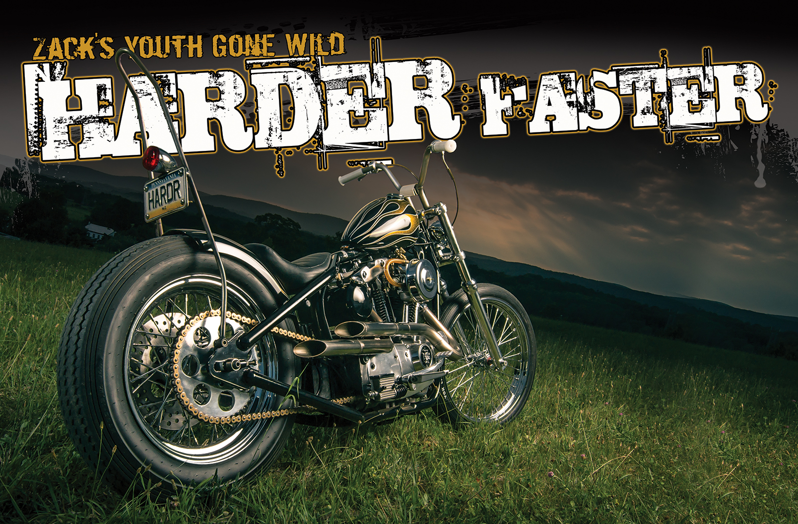 Zack Harnish had always been around motorcycles. His grandfather built up a pan chop in the 70’s that influenced Zack’s father and Zack’s father passed that inspiration on to him. His father took him to The Smokeout when he was eight years old and that left a lasting impression on him. He remembers seeing Indian Larry riding wheelies on his bike that day. Zack knew then he wanted to one day have a traditional looking hotrod Harley. He went on to race motocross for a bunch of years. He won track championships at Pagoda and Sleepy Hollow tracks in Pa. It got to a point where he was needing to travel more and more to race. Zack got burned out of the motocross deal with the money becoming an issue. School, job and “normal” life where the deal for a few years. As time passed Zack got the itch for a bike again. His father was in Oaks, Pa. looking at a bike for himself at Brian Burke’s East 11th Cycles and saw this rigid 1984 Ironhead sitting around. It was a bike that Brian was building for himself. After a lot of negotiating the Ironhead was on its way to Zack’s home in Lancaster. Brian had already installed a Led Sled weld on hard tail kit. Brian also got it up and running before Zack got it home. The bike had a Low Brow peanut tank on it with a pretty basic paint job. That was not going to cut it. Zack got ahold of Todd Cassler at Flames Unlimited in Reading, Pa for some paint work. Todd ended up doing a bunch of other work to the bike as well. House of Color black and pagan gold was sprayed on the tank and the result is awesome! While the bike was at Todd’s shop he fabbed the exhaust up out of stainless steel and again the result is awesome. He also made a top motor mount and a new sissy bar. Zack had tried to order bars from LA Speed Shop and the ones he wanted where on back order at the time. Zack’s father was on vacation in California and not far from LA Speed Shop so he figured he would take a ride by to see if they had any. Chris Richardson told him that the bars where in fact not in stock but if he had an hour or so he would make them for him right away. Chris went to work and Zack ended up with bars he wanted. Big props to Chris for the over the top customer service. The stock Ironhead 35mm forks where changed out for some Wargasser shaved and polished 39mm forks using stock Sporty triple trees. The Bates style head light is from Cycle Addiction. The front 21” wheel was laced up to a spool hub and an Avon Speed Master tire was mounted up giving the front end a very clean look. The rear Harley wheel has a Shinko tire mounted completing the traditional Harley chop stance that Zack wanted.