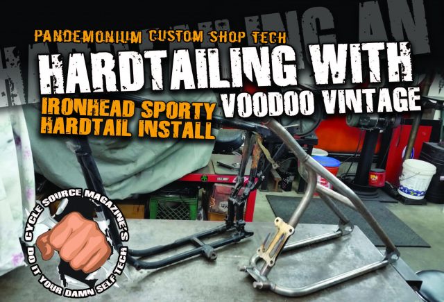 I had a local guy stop by the shop, wanting to know if I could put a hardtail on his old Ironhead Sportster. He had an old bolt on hardtail that he didn’t like the lines of. He had already bought a Voodoo Vintage weld on Hardtail that he wanted me to install for him. A deal was struck and he dropped it off at the shop. For this month’s tech I am gonna show you how to install the Voodoo Vintage hardtail on an old Ironhead. So with the bike and the hardtail in hand I went to the Voodoo Vintage website and downloaded the how to install instructions for this hardtail. They were very informative with step by step instructions, very straightforward and easy to follow. I began by making a reference mark on the back bone 8” from the front face of it. This will be used to help align the tail section. I then slipped the backbone through the upper frame rails and twisted it into shape. Making note of my 8” reference mark at the upper portion. I then used a string to align the backbone into the center of each axle plate. With this done, I placed a tach weld on the lower portion/ seat post. Using the 8” reference mark on the backbone. I aligned the upper frame portion with this line and placed 2 small tach welds there. With the backbone tach welded into place it’s time to move on to the next step, measuring and cutting the Ironhead frame. With some measuring and marking on the frame, a cut-off wheel was used to remove the unneeded section. I deburred and cleaned the frame tubing sections to prepare them for the installation of the hardtail, on the 3 cut locations. I then drilled the 3 locations about a ½” in for rosette welds. I then installed the hardtail into the 3 frame locations. I used a soft rubber mallet to achieve this. Then I installed the engine into the frame along with the rear engine mount plate. I wanted to see how everything was going to fit before I started welding everything permanently. I then used a string from around the neck down the center of the backbone into the center of the rear axle plates to check the backbone for straightness. With everything looking great I put 3 small tach welds, one on each tube. Then checked for straightness again, with everything still looking great, I put a couple tach welds on the rear engine mount plate. I began to weld the hardtail on to the stock frame sections, moving around from one joint to next trying to keep my heat even. Constantly checking that everything is remaining straight. With all the finished welding all wrapped up the installation of this Voodoo Vintage hardtail was very straightforward, and it only took about an afternoon to complete. Installation of this Voodoo Vintage hardtail on this old Ironhead was very straightforward and the fit and finish was great. It damn sure looks a hell of a lot better than the bolt on hard tail that was on it!