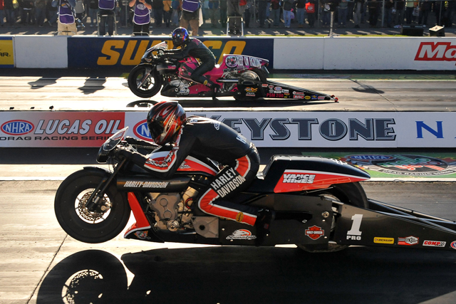 MOHNTON, PA. – Harley-Davidson® Screamin’ Eagle®/Vance & Hines rider Andrew Hines battled to his second Pro Stock Motorcycle final-round victory in the NHRA Countdown to the Championship playoffs at the NHRA Keystone Nationals. Propelled by the V-Twin power of a Harley-Davidson® V-Rod motorcycle, Hines has two wins in four Countdown events and now has a commanding 89-point lead on the Pro Stock Motorcycle field with three races left.