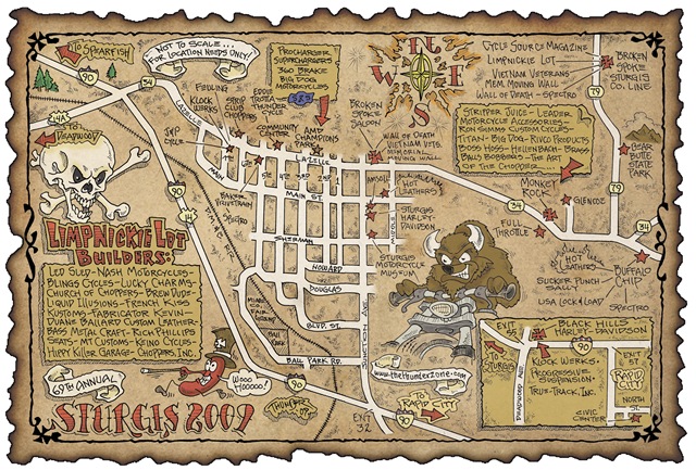 A big thank you goes out to Thunder! He stepped up yet again and produced a kick ass map of all the places to be at in Sturgis. You can see Thunder’s work monthly in Cycle Source, in the features “Gut Busters”, “Letters to the Editor” and also his comics “Low Down , Dirty Rotten”. Check out his new web site and look for the map in the August issue on pages 46-47. Don’t forget to put The Broken Spoke Campground on your agenda. Come by the Cycle Source booth and hang out with the guys from the Limpnickie Lot!