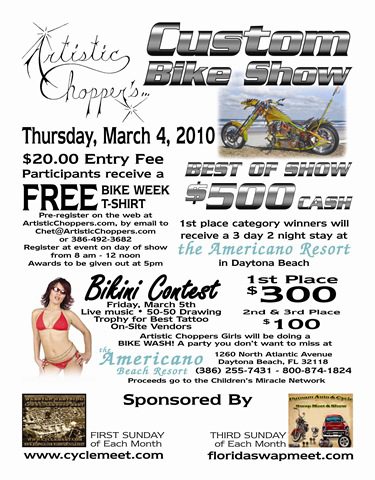 Attention Builders: Are you interested in entering a new custom bike show that offers you $500 cash for the best of show! Plus 3-day/2-night stay at Americano Resort to ALL top category winners (8 categories.) It will be held on Thursday, March 4th during Daytona Bike Week 2010. Every year, Chet Moraniec of Artistic Choppers in Ormond Beach, Florida builds a custom chopper for the Children’s Miracle Network, an organization that helped he and his wife, Gaylyn save the life of their young son, 13 years ago. You will find more details at ArtisticChoppers.com. All of the proceeds will go to the Children’s Miracle Network.