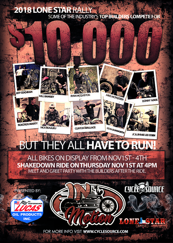 2017 was the first offering of a brand new type of show called In Motion presented by Lucas Oil at the Lone Star Rally in Galveston, TX.  14 builders from across the United States have been invited to create a one of a kind custom motorcycle that not only exemplifies This motorcycle show started with bikes that had to perform a shakedown ride to be eligible for the vote. At the end, the winner will walk away with a $10,000 prize.