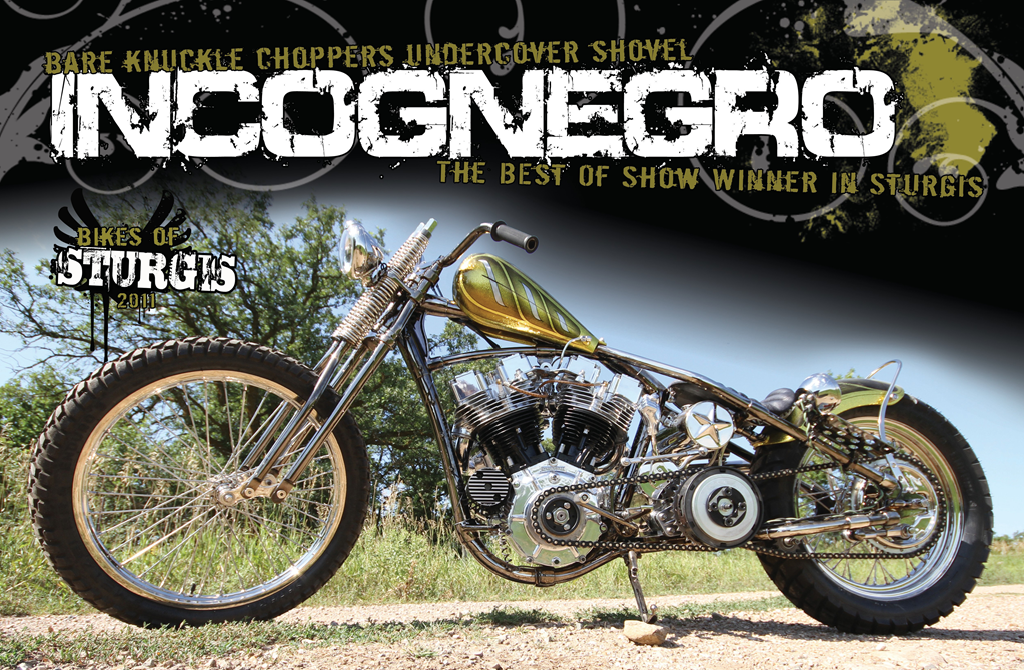 On a final note, ol’ Russ was a happy boy in Sturgis to finally roll out “Incognegro” and take top honors. We got to display it on stage at the Buffalo Chip in front of everyone and tell them all he was the man of 2011. The last time I saw Russ, as a matter of fact, he still hadn’t come down off of that high and was talking about what he wanted to make the roller he won into for next year. Well, all I can say is that you cats who are gunning for his belt better bring you’re A-game. The 2012 Cycle Source Chopper Show is only eleven months away!