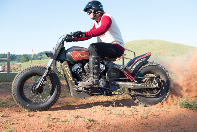 Transforming the look of the Scout started relatively easily with the addition of several new Indian Motorcycle accessories including the 1920 Solo Saddle Seat (MSRP $379.99) and a set of the accessory laced wheels ($499.99 each). Custom details that set the bike apart include an elongated custom swingarm, custom handlebar, custom radiator shroud and front number plate with an LED headlight. The 100+ horsepower of muscle in the Scout powerplant chewed up the earth via a custom tire chain designed for maximum grip when charging up a hill.