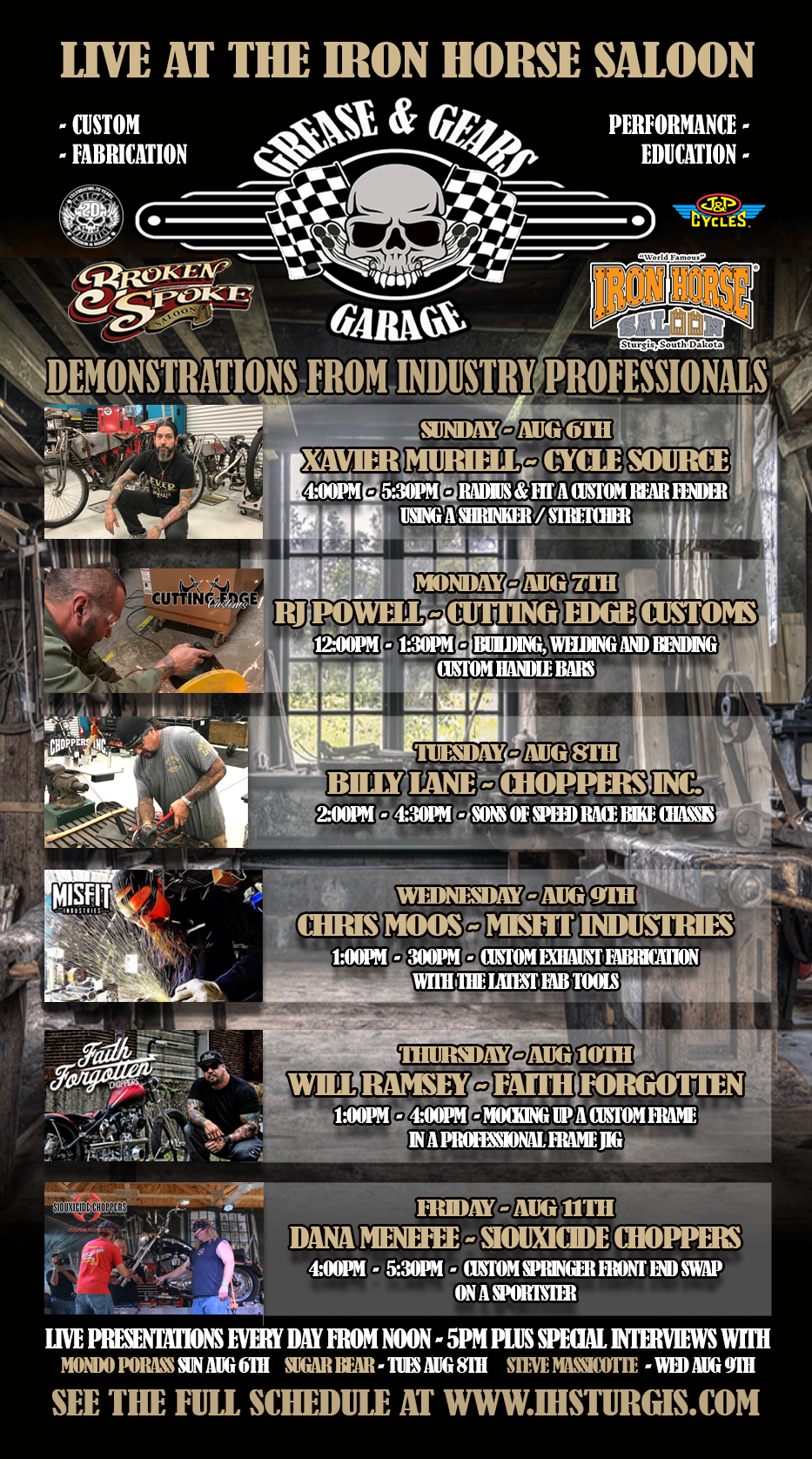As part of the offerings from the Iron Horse, a the Broken Spoke Stage, from 12 to 5 each day, rally attendees and viewers from around the world can witness live performances on stage with some of the most recognizable names in the custom industry today. Pat Jansen, Grease & Gears Garage Master of Ceremonies will be roaming through the crowd to give onlookers the chance to ask industry professionals questions while they are carrying out their work.