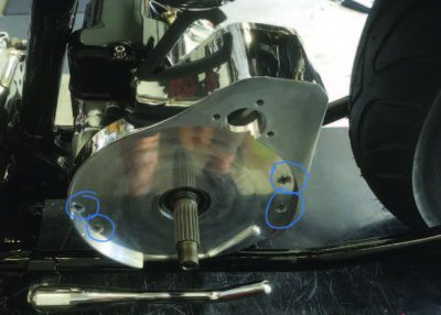 Once you’ve got the belt on the pulleys and have the motor sprocket nut and main shaft snug, you can move onto alignment. Now, since I went with a softail style tranny, and not a 4 speed that mounts on an adjustable plate, it’s a little harder to get the alignment since there isn’t an adjustable plate for a 5 speed style case. After some work, I got the alignment right and just to make sure I used a straight edge to verify that my belt would run true and not cock eyed. This can be done by jacking up the rear wheel, placing the tranny in its highest gear (to turn easier) and spinning the wheel to see how it tracks. If all looks good, then reverse what you just did for disassembly and start the process over again. Tech Cycle recommends a dab of red Loctite on transmission main shaft nut.