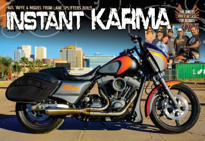 What you’ll see here is in this humble correspondent’s opinion, the future of motorcycling in America. We love the handling; we love speed, we love leaning over a little further than we should in the twisties but many have given up on choppers with their rigid frames and FXR’s or Dyna’s for great big baggers and the joy of comfort. There lies the inspiration for the Sport Touring bike. Go fast as hell, be light, be nimble, handle like it’s on rails, be able to pack more than a phone and do it all two up if need be while pulling a monster wheelie were the parameters set before the build, and the result is all of the above and more! When your name is Paul Yaffe, you hold a lot of “chips” and have the direct phone numbers to all the right people and believe me, Paul used them to get the parts needed that could not be fabricated in-house and then played one of my favorite chips of all, he brought in Miguel from Lane Splitters Garage in Phoenix as his partner on this project. If ever you get to Phoenix, I urge you to visit both shops. Both teams, Lane Splitters, Paul Yaffe Originals and Bagger Nation pulled many a late night turning this bone stock 2016 Road King into the beast you see here. Several of the parts are simply oneoffs or the very first of their kind. So much weight was taken off this bike that when you stand her up off the kickstand, you nearly throw it over on the ground it’s so light. The heart of this beast comes fresh from the Vance and Hines Race shop with more power than most will ever need. Check out the cerokote that adorns much of this machine. The wheels and swing arm came by way of Brock’s Performance and were responsible for a huge portion of the weight exchange from bricks to feathers. The swing arm alone looks like it weighs a hundred pounds, but you can pick it up with only a few fingers, and the carbon fiber wheels are a work of art! There are so many details and so many people to thank that it’s hard to do them all justice, so I’m going to include who they are and what they brought to this build on the tech sheet, it could have never been done without them, period!