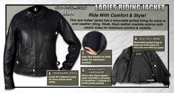 Ride with comfort and style in the new ladies riding jacket. The new ladies jacket has a removable quilted lining and underarm vents to keep you comfortable. Its sleek black leather cowhide exterior with elastic sides, offer riders mobility, style and luxury.