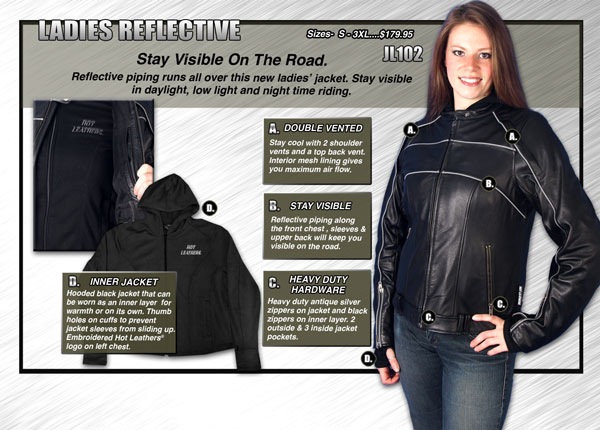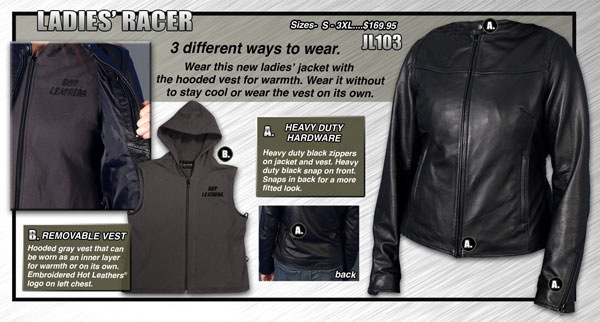 Also available is the ladies reflective jacket with visible piping to help keep wearers noticeable in daylight, low light and nighttime riding. And you can’t forget about the ladies racer. Wear this new ladies jacket with the hooded vest for warmth, wear it without to stay cool or wear the vest by itself. Three stylish and comfortable ways to wear one quality leather jacket.