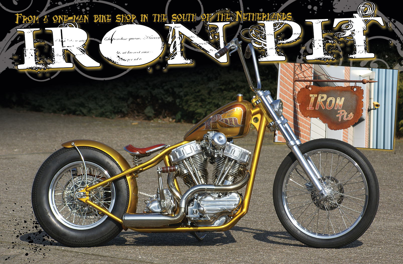 Ronny, owner from Iron Pit, Helmond, Holland is becoming a pretty big name across the big pond. The man started drawing attention by designing and creating performance parts for panhead motors and today he is building very cool bikes, like the one pictured here. I am visiting Iron Pit, a one-man bike shop in the south of the Netherlands . Reason for my visit? This gorgeous panhead chopper! I saw the bike for the first time at a trade and bike show held by the Dutch Bike magazine Bigtwin in Rosmalen. It was drawing crowds! Like all other onlookers I immediately fell in love. What a clean sweet bike this is! I just had to photograph it. Today I am at Ronny’s shop and I ask the man what inspired him to build this great panhead. Of course I am following everything that is happening in the chopperscene but I try hard not to get influenced by it all. You might think you recognize some ideas I took from others but to be honest the Super Pan almost looks like the very first chopper I ever had, some twenty years ago. Okay, I made this bike narrow, as narrow as possible, and yes, I have noticed other people doing that too. And of course I must subconsciously have been mixing ideas from others with mine but I always try to be original, that’s all I can say’. And indeed, we see a lot of stuff on Ronny’s panhead we have never seen before, starting with his cylinder heads. ‘I designed those a long time ago’ Ronny explains. ‘Stock panhead heads have a pretty bad flow and they also tend to get too hot. I made downdraft heads with a complete different and much improved flow and mounted them on one of my own bikes. I rode it years and years and I can assure you they work way better than stock ones! I have already sold many’. The other unique thing I notice is the sweet gas tank that, or so I am told, once started life as a Jesse James Villain tank. The grips are made f r o m slices o f leather like you once saw on old hammers and look so good.