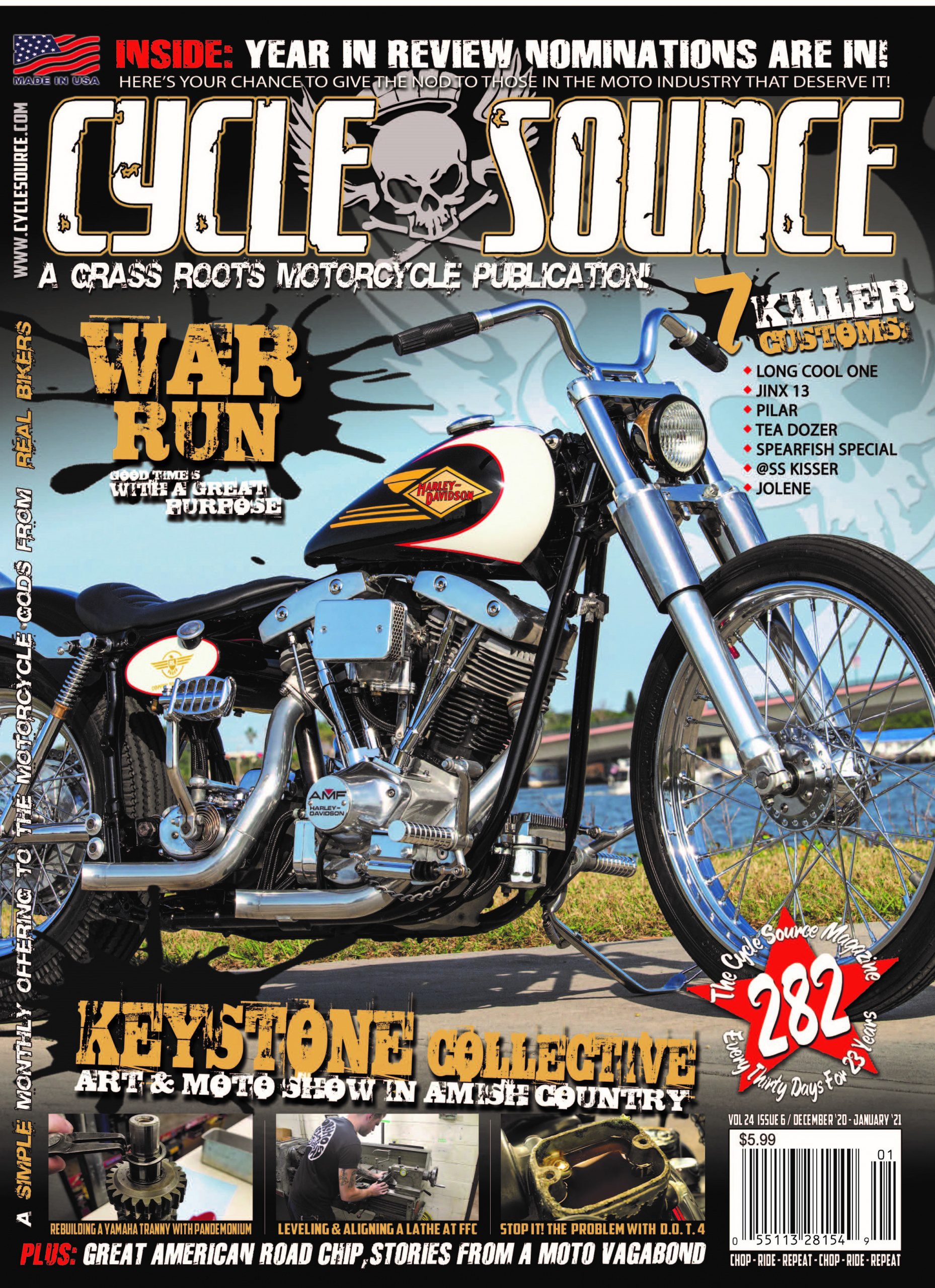 Issue 282 of Cycle Source is chock full of goodness and features the inaugural article The Great American Road Chip, a relatively new moto vagabond on the scene. Dan Vendittio takes us back to the Keystone Collective and Panhead Jim shares a tale of the War Run. Not one, or two but SEVEN great feature bikes fill our pages and range from a bitchin antique Knucklehead Bobber to a Klockwerks FXRP with everything in between, including a Sportster, a Shovelhead and much more. Our tech gurus take us to school on DOT 4,  how to level a lather and Daniel rebuilds a transmission at Pandemonium.
