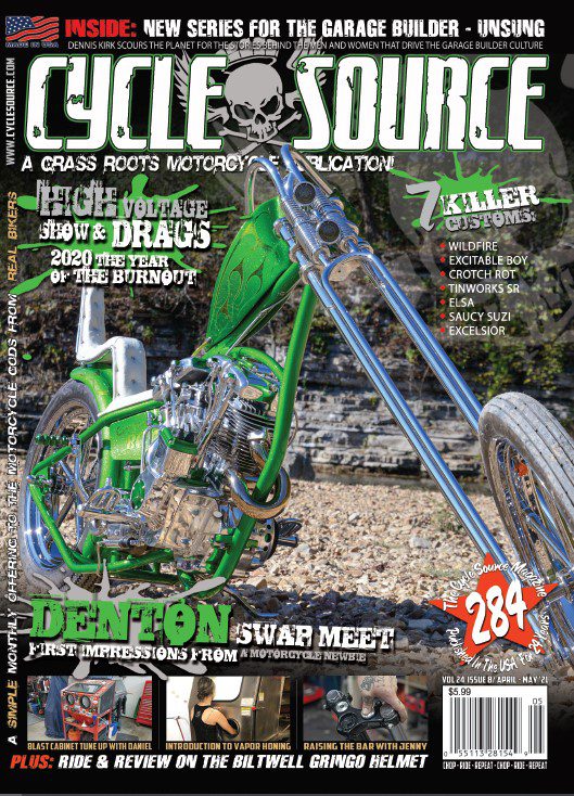 Issue 284 is just hitting subscribers now and man you’re gonna want this one! This incredible issue features a Killer Chop by Brock Bridges on the cover and 6 other stellar bikes that cross many makes, models, and styles including an RS250, Saucy Suzy, A Cool XS., and a 1919 Excelsior. Jenny Leffert joins us for this issue by “Raising The Bar”, Cycle Stop USA introduces us to the wonders of Vapor Honing, and Pandemonium teaches us how to save a tired sandblast cabinet. We’ve got another newbie in this issue that shares the story of his first trip to the Denton Swap Meet. The Great American Road Chip, Chopper Charlie, Jimmy Frizzell, Xavier and InSlide Line all take their place with their regular columns as well. All In All, it’s a killer issue!