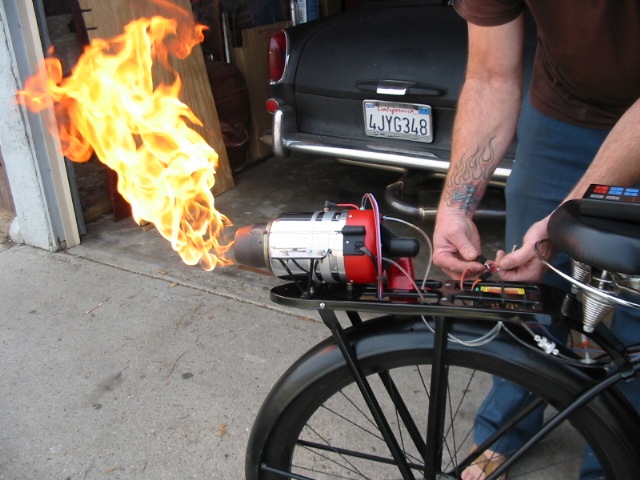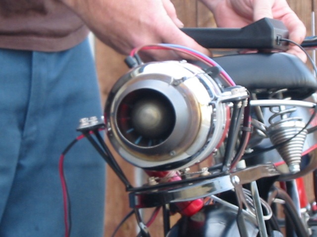 He has taking a small jet engine that is designed for giant scale airplanes and loaded it to the back of his bike. Don’t worry, this is Bob’s day job. All systems go!!!!!! If you are at the David Mann Chopperfest stop by Duane’s booth and check this thing out.