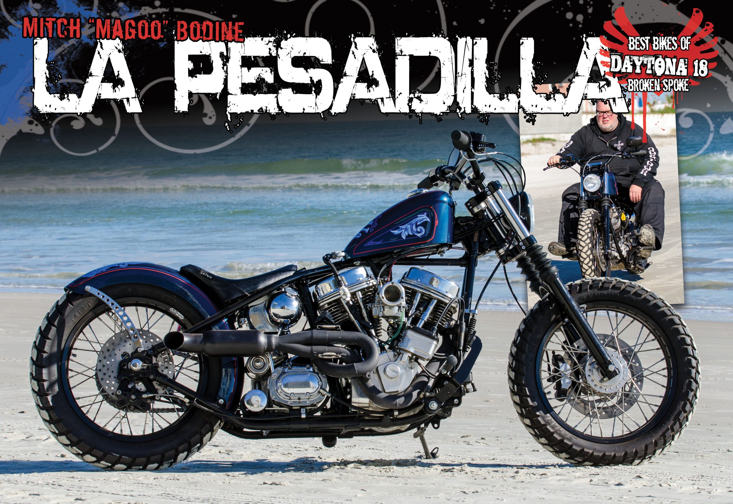 All this power is transferred to the pavement via an H-D six-speed transmission. An often overlooked take off item that will save you a ton of money for an overdrive but does necessitate the use of an electric starter; this has been handled by a Tech Cycle starter attached to a custom chain drive open primary also by Tech Cycle. The primary is running a 530 chain instead of the usual dual row chain. The frame was treated to a simple black coating, and the sheet metal paint job was mocked up with a rattle can. When the Led Sled rear fender and Sportster tank were brought to Ryzart in Northern New Jersey, they decided that he would go with what they had mocked up and he did it to show quality specs. A simple blue with silver leaf accents, none of that mondo-dune buggy-bass boat, carnival flake that’s all the rage this week. This isn’t one of those builds that’s looking to change the world or show some incredibly rare dustcovered relic. It’s an assembly of take off parts and a potent drivetrain, assembled for a bike that is clean, simple and capable of taking on the street in stellar fashion. Built to be ridden hard, the right coast way. “GTP”