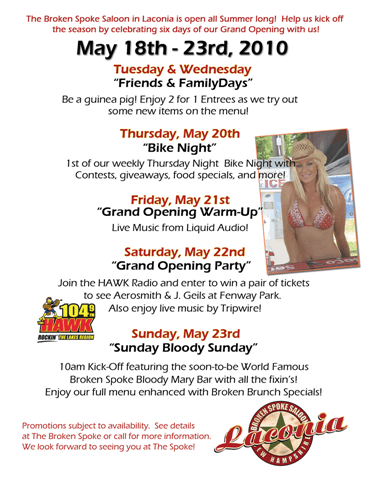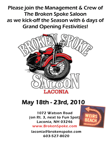 - Hey East Coast Readers, Broken Spoke Laconia is now open for the season!