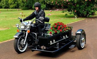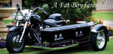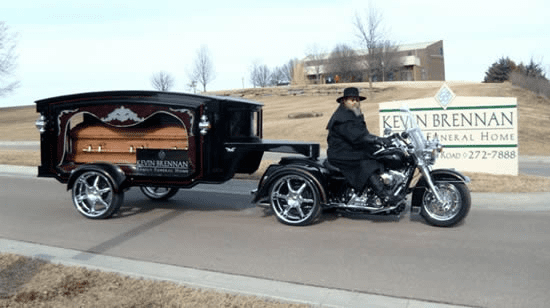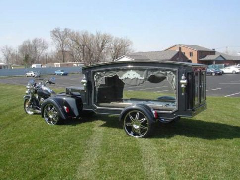 WheelsHearse-Photo-3So I don’t know why I started looking for this but I did. How would you like your last ride into the sunset to be in a motorcycle hearse? Well it is possible. There are quite a few funeral homes that offer this service. There are at least two motorcycle hearses in the state of Ohio and about 45 across the United States, I actually found one in our area that does offer a motorcycle hearse. This is according to the American Motorcycle Hearse Association.