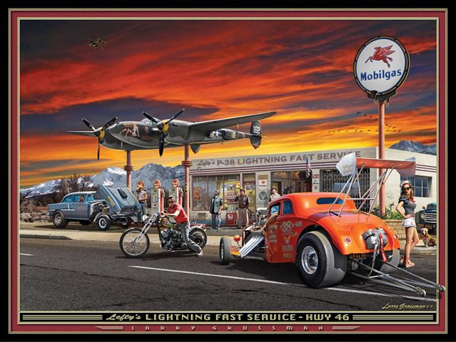 Holy Cow, this time hot rod artist Larry Grossman has really outdone himself! His amazingly detailed new picture "Lefty’s Lightning Fast Service" really has it all: a bad-ass blown ’33 Willys, a tilt front-end ’55 Chevy straight axle gasser, a bitchin’ ol’ skool hog chopper …and an absolutely awesome P-38 Lightning WWII fighter plane mounted above a classic vintage Mobile station (with a B-25 bomber flying overhead!). Oh, and and there’s also three gorgeous babes in there to get your interest fully up! You can purchase this stunningly cool, high quality 18×24" Lithographic Print for only $30 (or $35 hand signed and dated in gold ink by the the artist). And get this, Larry can even create a custom personalized version of this or any of his pictures featuring your car and/or bike (and you or whoever) for a reasonable fee! You can see, buy, and get the full lowdown on all of Larry’s art on his great website: www.retrovisions.com What’s that, computer’s ain’t your thing? …then order by phone: (818) 907-8626 (after 10 am Pacific Time please).