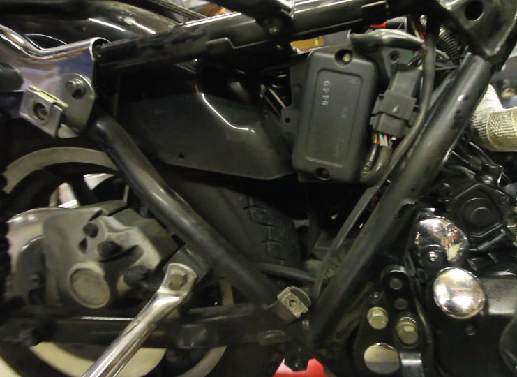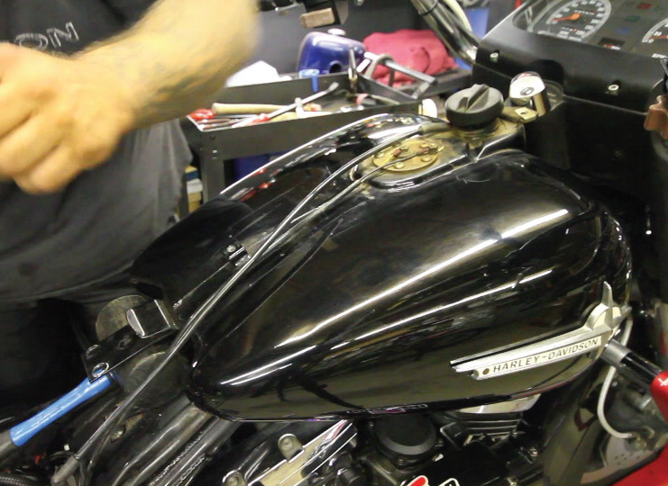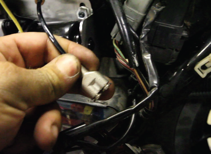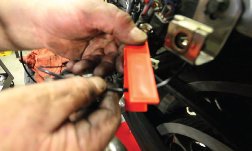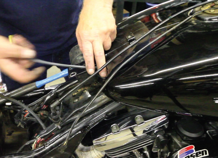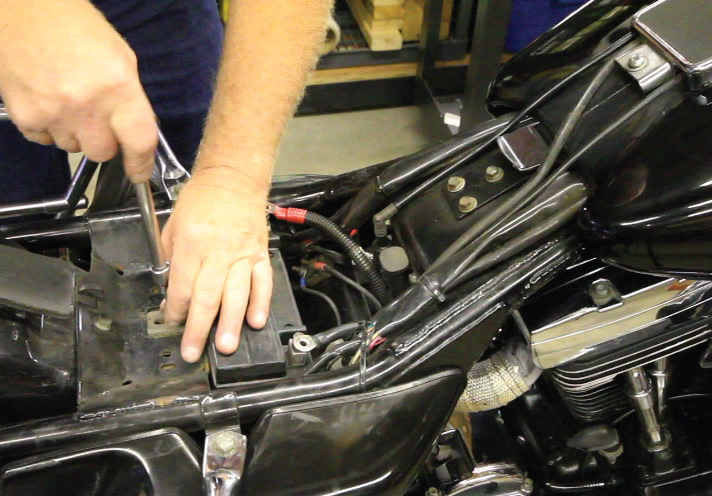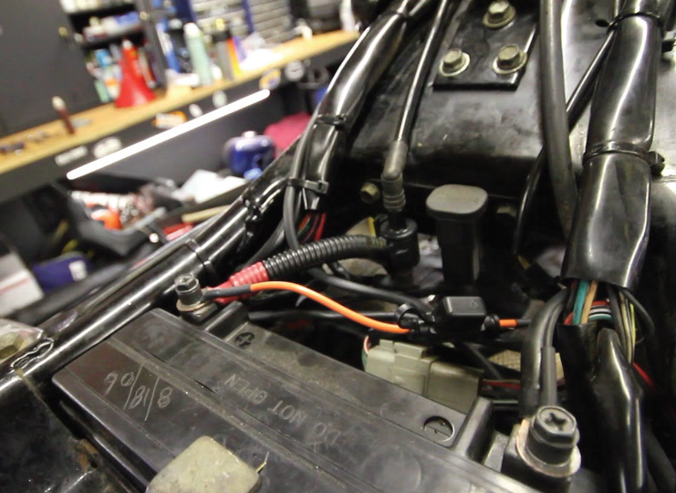 With the first two bolts in loose, we run the wires down under the tank and into the battery compartment.