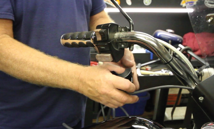 Next, we remove the stock clutch clamp on the left handlebar. This is where the new clamp with the control buttons will be installed.