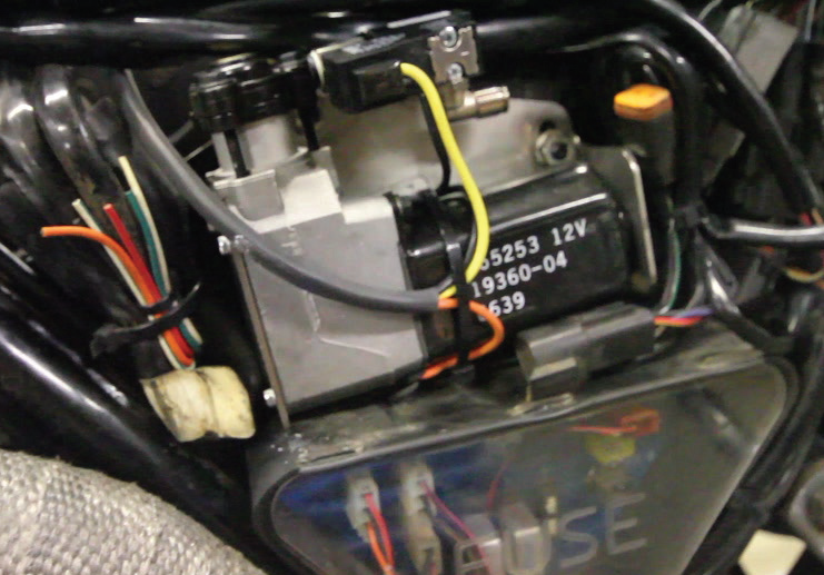 No big deal, the left side cover revealed a nice area that we could mount it to with minimal effort. Once the mounting is good, we connect the wires from the control, the wires from the relay and the battery wires (all color coded) to the compressor.