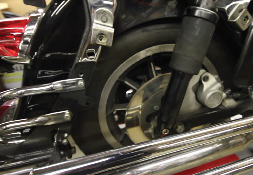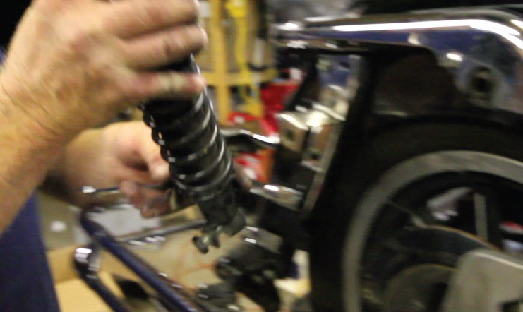 Now we take the rear shocks off, adding height to the frame jack to the point that the swingarm hangs a little loose.