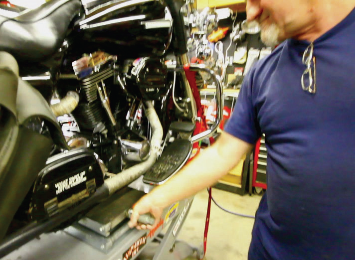We start by securing his bike to the lift table and get a jack under the frame so we can get to work.
