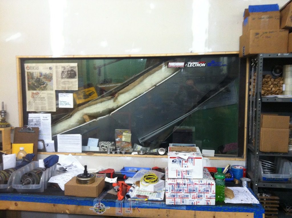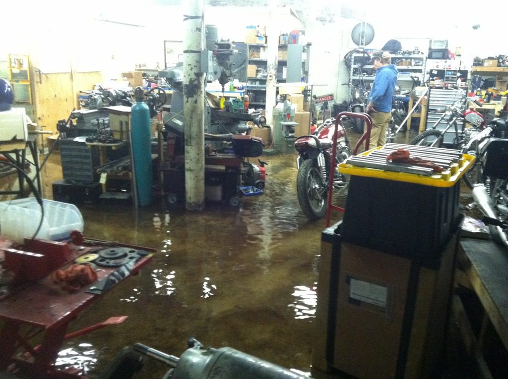 Over the weekend, Hugh’s Handbuilt suffered a massive flood. Mind you this was not a flood from normal circumstances. This was due to a failure in a Fire Protection Sprinkler line. He was all packed up and ready to head out to The Ramble Tamble until he got a call at 2:45 am from the fire department. After he arrived at his shop to see the massive water line just bursting water everywhere. One of the very old pipes burst and the fire department could not find the shut off valve for 40 mins.
