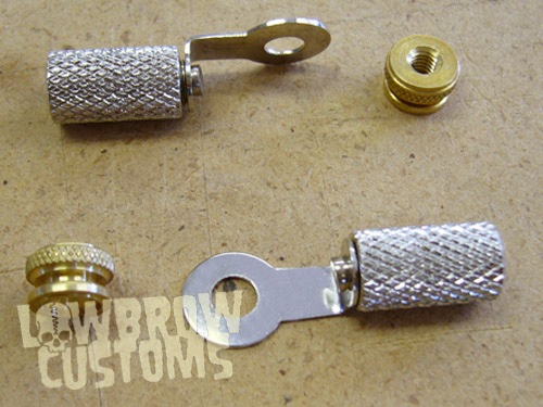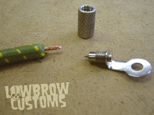 These brass spark plug terminal nuts will fit any modern spark plug with a removable top nut. This includes NGK, Champion, and any other major brand. Also included are nickel-plated Rajah ring terminals. Add some vintage flair to your stock bike or your custom bobber or chopper.These are a screw on style, you strip the end of your plug wire, insert, and screw the terminal on, as shown below. The ring terminal is held in place firmly with the brass spark plug nut. Two brass nuts and two Rajah ring terminals are included. Cost 8.00 each, to see more on this and all other available products, click here.