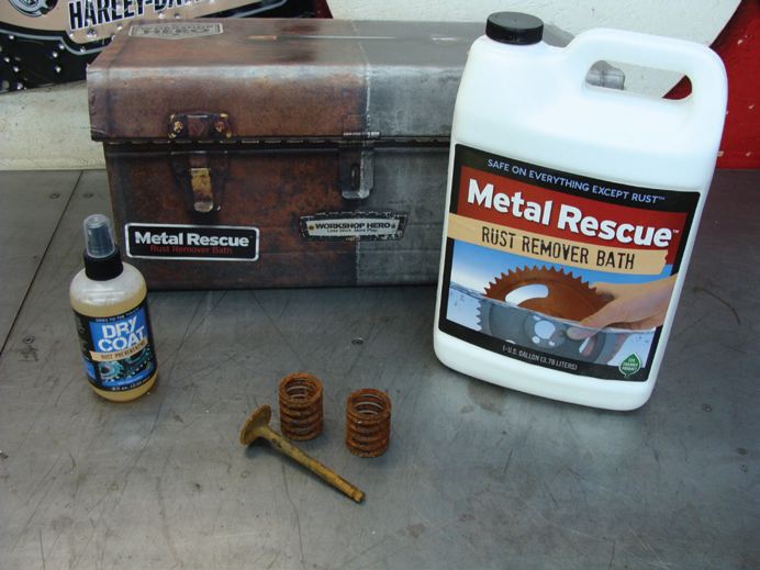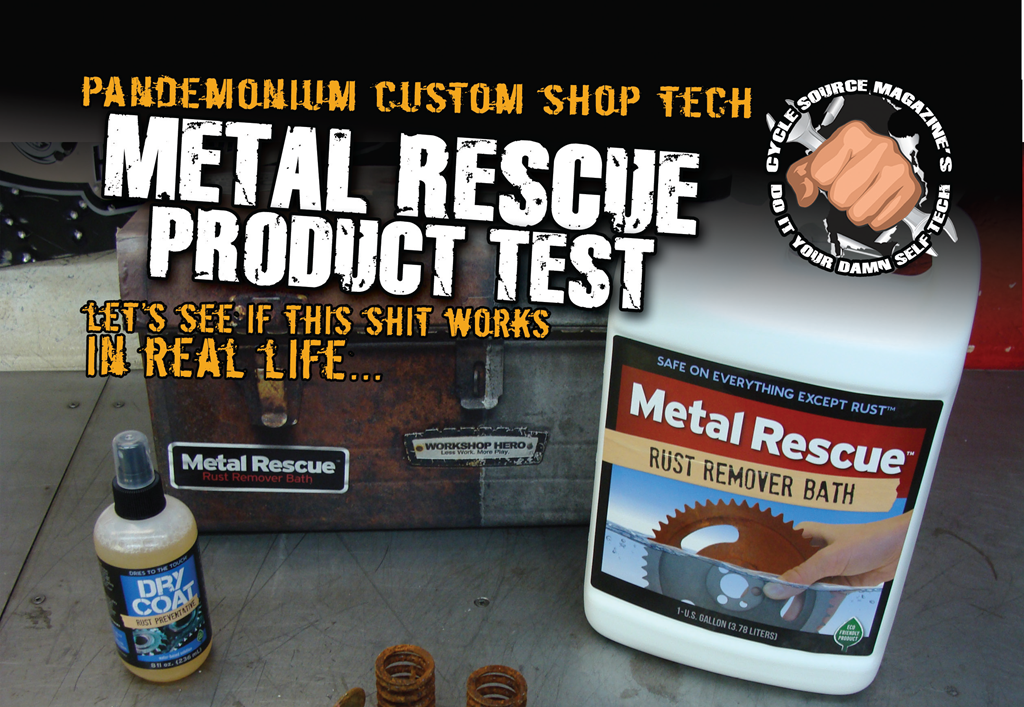 So with the Metal Rescue in hand, I headed to the Pandemonium shop. I dug around the place to find some good test pieces: an old rusty valve and spring, a rusty chrome plated engine mount, and also an old gas tank that was full of rust. I figured these pieces would put