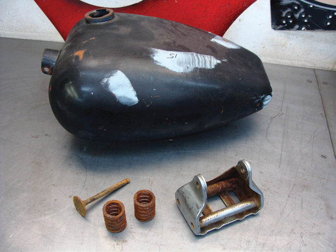 One old gas tank, valve and springs, and a chrome engine mount. These will be great parts to try the Metal Rescue Rust Removing Solution on.