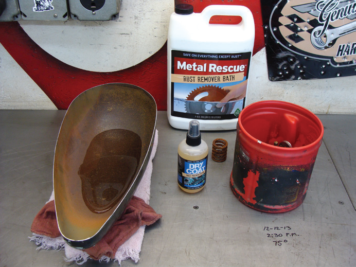 Well, the next morning came and I headed to the shop to check on the progress of what the Metal Rescue had done overnight. The first thing I noticed was that the once clear solution was now gray. I immediately thought that something must have happened while I slept. I removed the parts from the Metal Rescue, and I‘ll be damned, this stuff works: clean, raw steel! I rinsed the parts off with the Metal Rescue from the plastic coffee can then dried them with air from the compressor. These parts had no rust on them! They looked amazing!