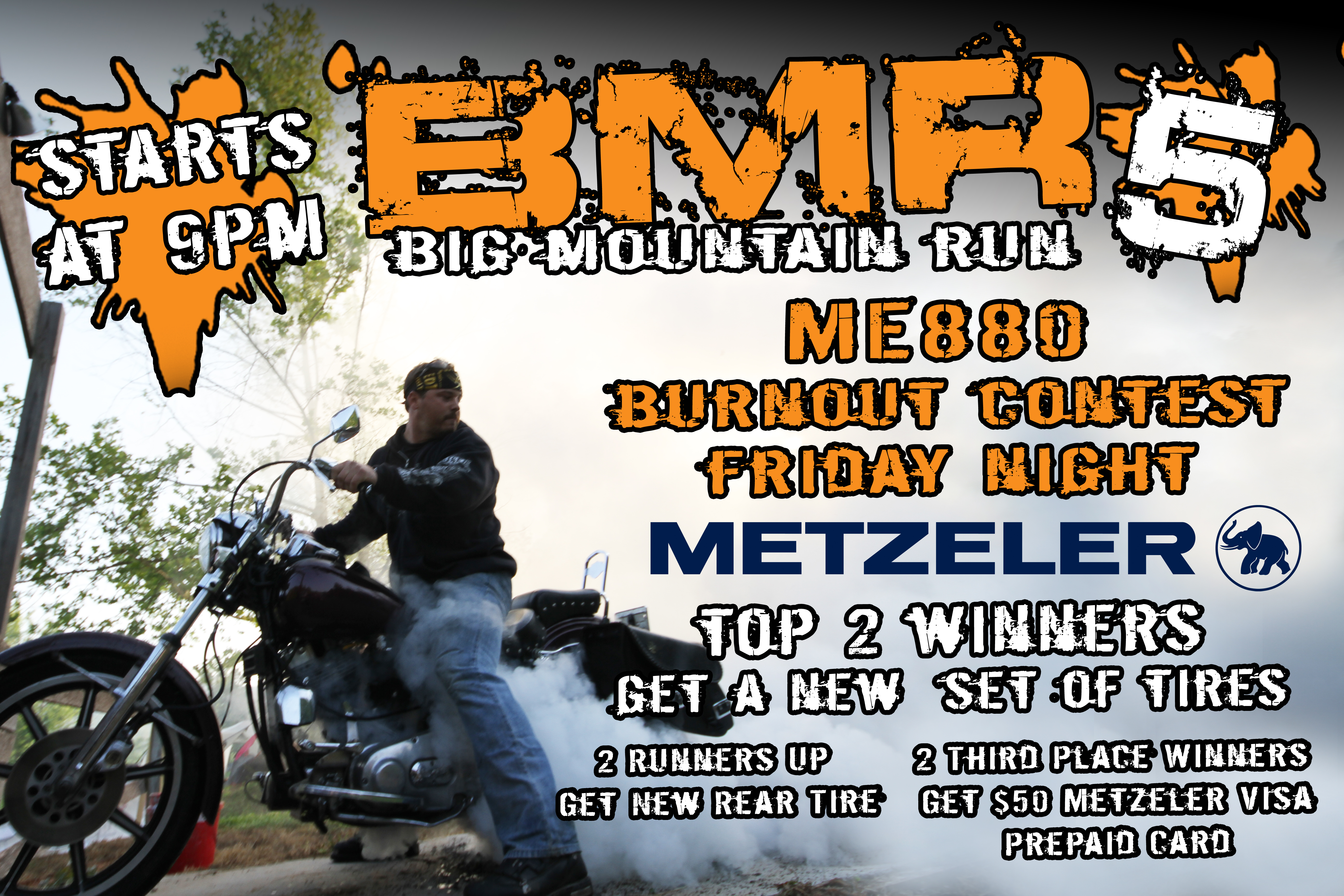 The burnout pit is ready in Tucker County and waiting for BMR riders to roll in and tear it up. We have six prize places for the Best Burnouts Of BMR this year. The ME880 Burnouts at BMR will give a brand new set of Metzeler tires for the two top spots, two rear tires to both runner ups and two 50 dollar Metzeler Visa prepaid cards to two third place winners. In addition you picture and video performance will be plastered all over Cycle Source media and it’s all for a great cause…. Havin’ a blast!!!!