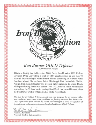 Well, he’s up and at it again, riding in Arizona as I post this news item. When he returns to Wisconsin, he and I will head for Florida on March 30th to pick up a couple of other riders. John “Rogue” Herlihy, Sturgis Freedom Fighter Hall of Fame member and well known photo-journalist, will ride back to cover this historic event for several bike magazines and Bikernet.com internet news. Joining him will be Bruce Arnold, Miami, who just recently was certified as the first Harley-Davidson rider to complete the Iron Butt Bun Burner 4500 Trifecta.