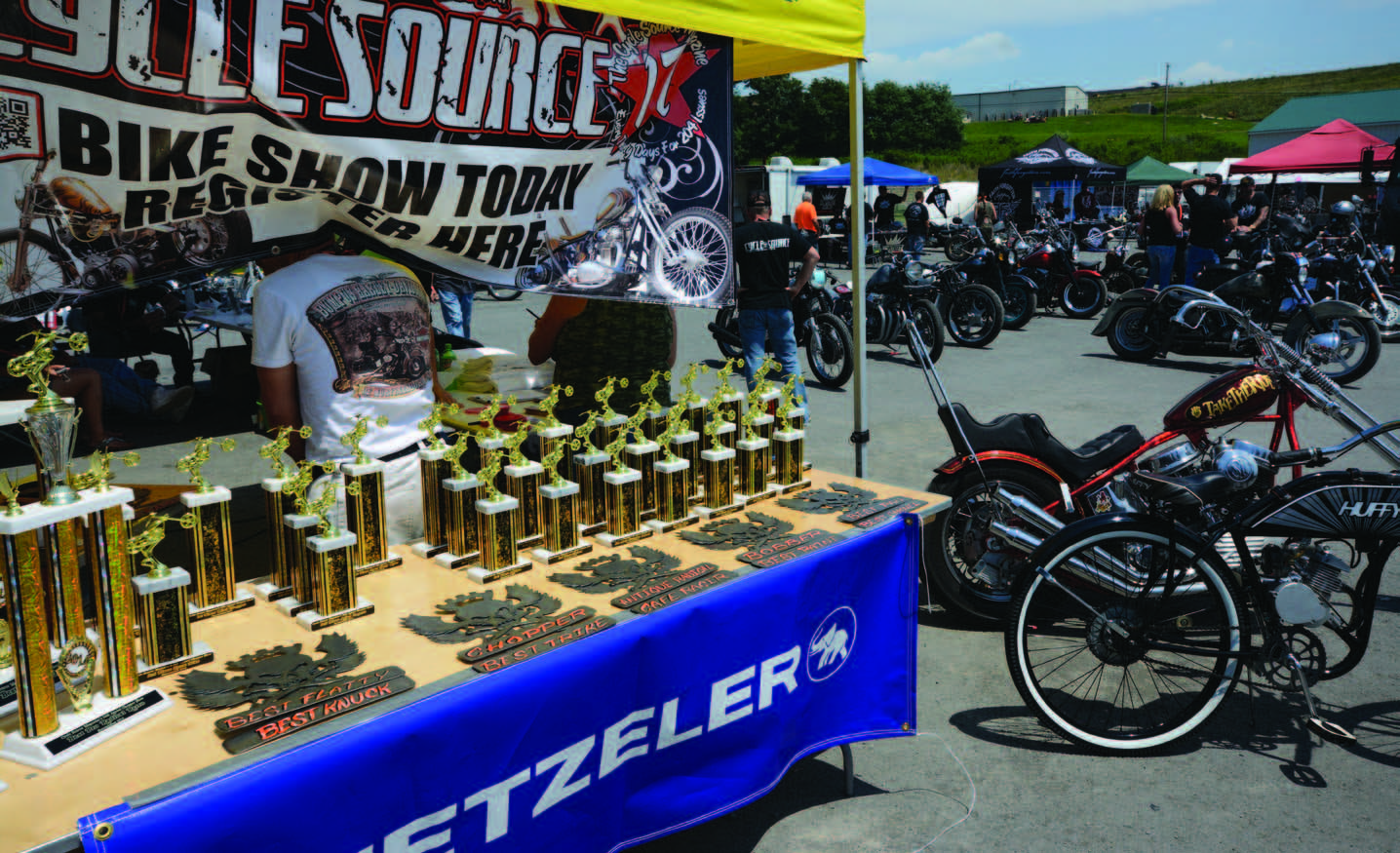 The ride back is somewhat less organized and eventually we end back up at the fairgrounds where Ted Nugent was playing this year. I spent a considerable amount if time taking the Panhead front head on and off for practice in the parking lot where the magazine and the builders were set up. It had been giving my trouble and I was stumped. On the lot this year were some pretty great names like Jeff Cochran’s Speedking, Faith Forgotten Choppers and Justified Defiance, just to name a few. These guys make it easy to hold a bike show that’s for sure. Saturday kicked off early again and we started signing up bikes for the show at 8am. By the end of the day there would be some 200 entries that were all bidding for their share of the 52 trophies in 16 different classes. Since this was the original Custom Bike show the magazine held in Pittsburgh, it’s still the only one that we do this big and that uses such strict judging criteria. So many great bikes from this part of the country roll in every year that it gets harder and harder to pick the winners. One in particular that we pulled out for a photo shoot with Jeff Cochran was a little shovelhead trike that I fell in love with. You can see it in an upcoming issue of Cycle Source.