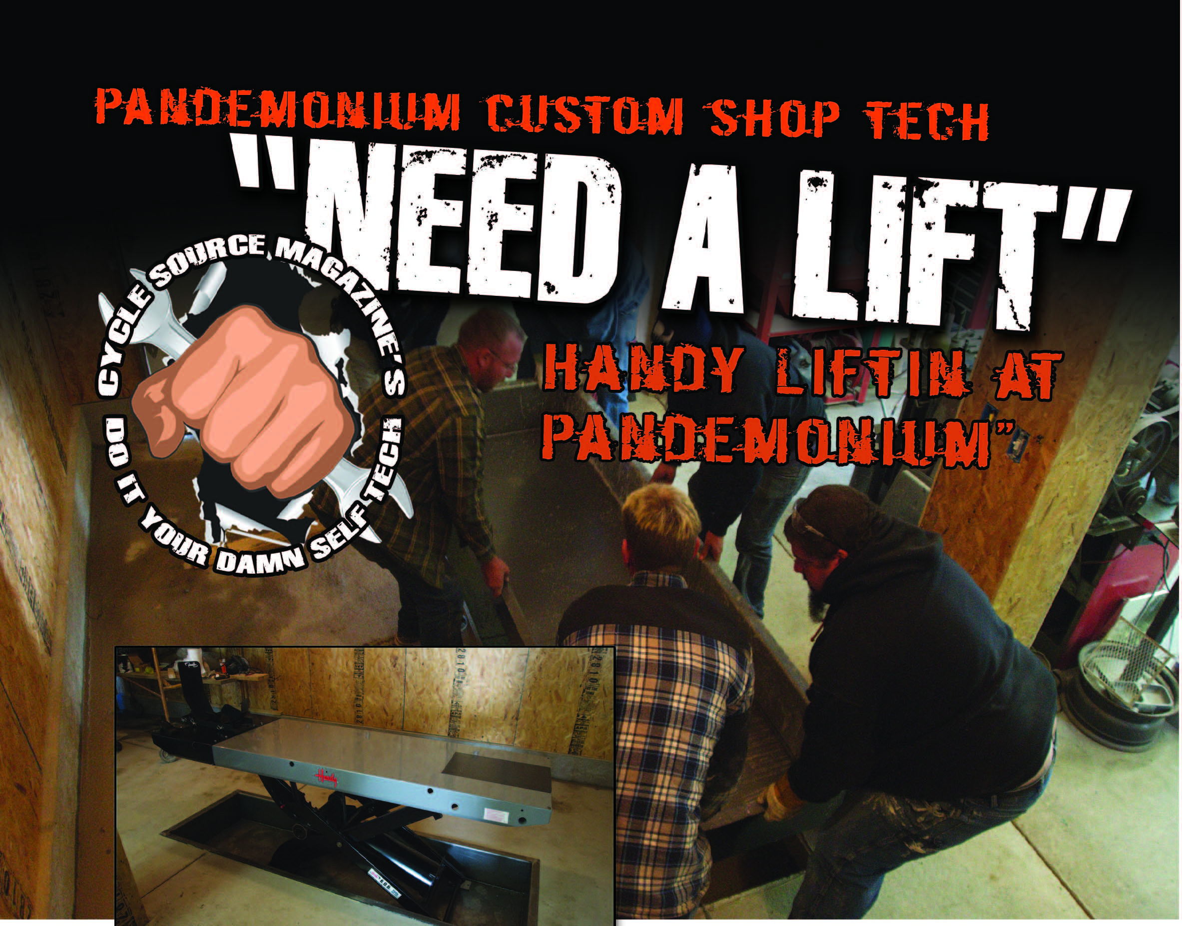 One Friday night, myself and a few buddies were shooting the shit and throwing a few back when Big John said “Dude, you need a bike lift. Ya know, one that goes up and down. I’m tired of lifting these bikes off these damn tables!” Well, that is where this month’s tech article stems from — that one Friday night conversation! We decided to install a bike lift flush with the floor and use a locking style wheel chock to allow for easy one man loading and unloading. I wanted a good quality lift and wheel chock, so I purchased them from Handy, which is proudly made right here in the good ole USA!