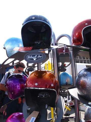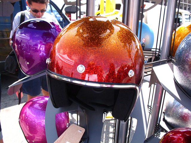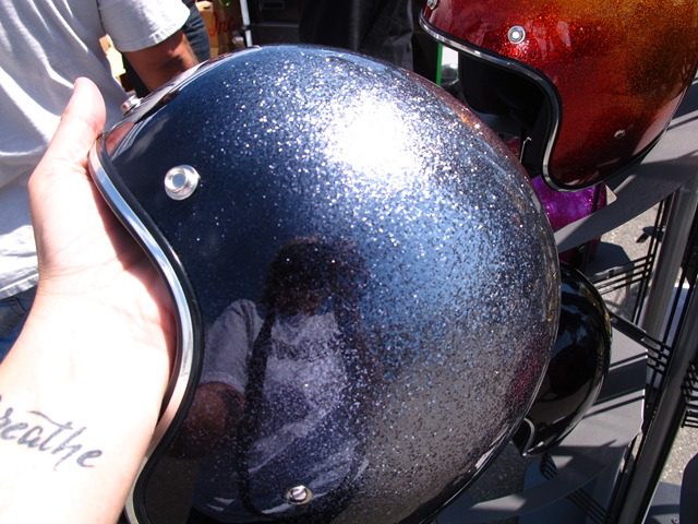 Making my monthly trek around the Long Beach Swap Meet, I always stop to see if there is anything new with the vendors. I was drawn to the new Biltwell, Inc’s helmet display at Lowbrow Customs booth . Some woman love diamonds, my thing is a shiny new helmet with insane colors. Biltwell has stepped it up with their latest Duo Vintage Style Megaflake Helmets, which are now available in Sunset– personal favorite- and Galaxy-smoky and yet mystical.