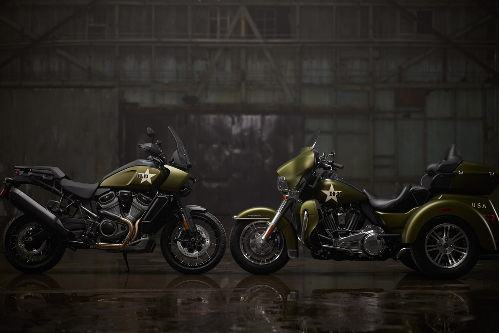 The G.I. Enthusiast Collection is draped in stunning Mineral Green Denim Deluxe paint, an all-new color created specifically for this collection, and completed with service-inspired graphics. The G.I. Enthusiast Collection is available only as factory-installed for the Pan America™ 1250 Special and Tri Glide® Ultra models, in limited quantities primarily for the U.S. market.