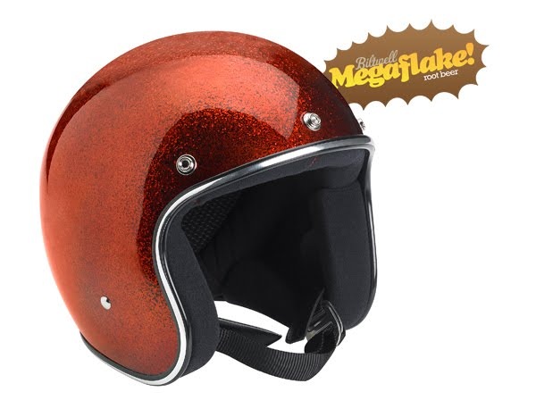 Biltwell_SunburstOrange_small As we run out of the old helmets we will introduce these new Megaflake models in some really cool new colors. The first two that are available now are Root Beer and Sunburst Orange. “One thing that hasn’t changed is the price. $114 MSRP is the same price we’ve had since day one.”