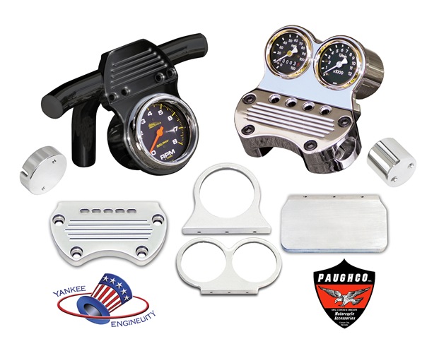 For your convenience the Universal Plates are sold in raw aluminum for 1” and 1 ¼” bars and retail for just $66.07. Chrome gauge mounts come in sizes and styles for stock, VDO, Digital Dakota, Auto Meter and other gauges with diameters from 1.9” up to 3 3/8”. Base Clamps and Gauge Tops can be purchased individually and are universal so you can mix styles and shapes. While YE custom base clamps cover most H-D models, the brackets can be adapted to a wide variety of Cruiser and custom machines. Base plates retail starting at $87.70, Top Brackets from $112.78 and Cups start at $100.81. For complete details contact Paughco direct at 775-246-5738, email info@paughco or catch them on the Web at www.paughco.com.