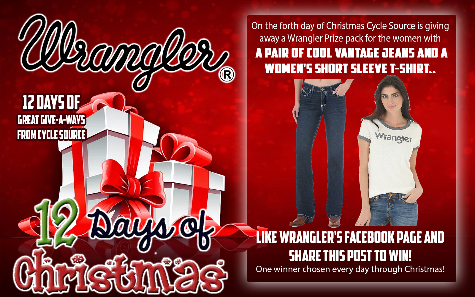 On the fourth day of Christmas Cycle Source is giving away a Wrangler Prize pack for the women with a pair of Cool Vantage Jeans and a Women’s short sleeve t-shirt. Like Wrangler’s Facebook page and share this post to win! One winner chosen every day through Christmas!