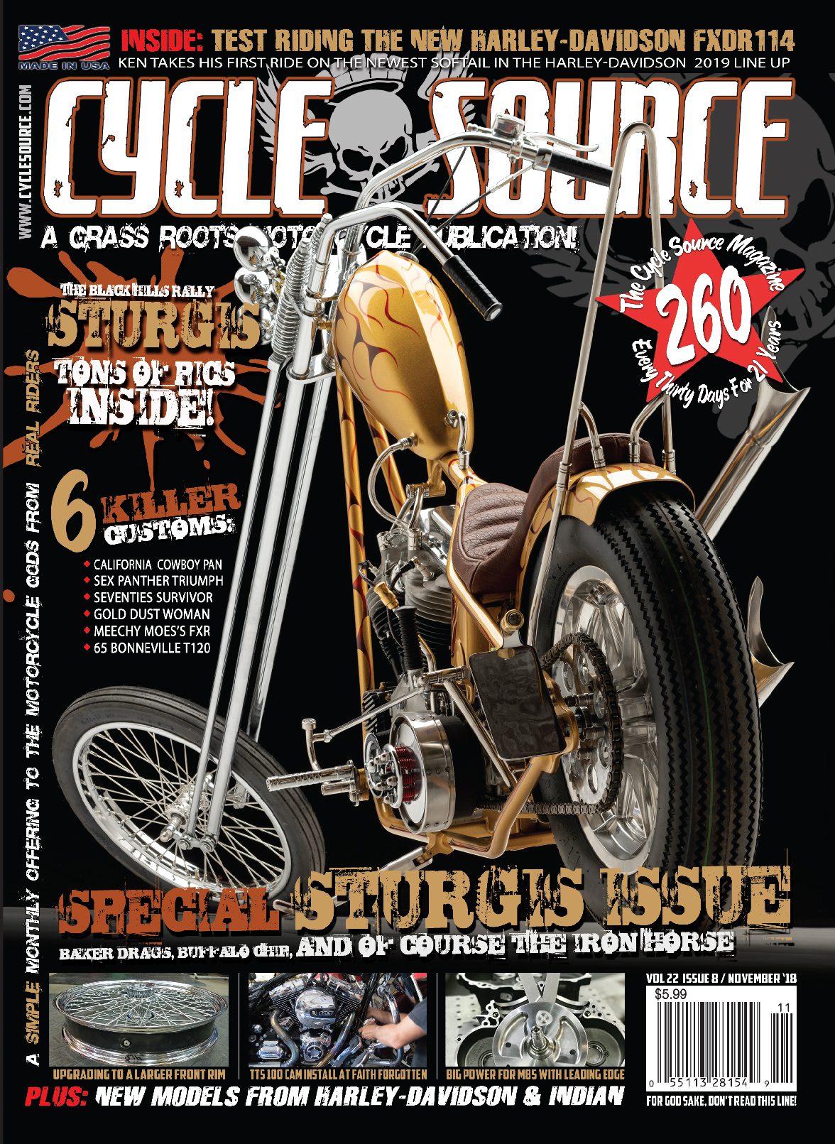 Clinton Wallace graces our cover for the Sturgis Special Edition with his Gold Dust Woman. From front to back this month is paced with Sturgis coverage and tons of great photos from the 78th Annual Black Hills Classic. Read about our bike show at the Iron Horse, Our Ride to the Ranch at Spur Creek, Michael Lichter’s “Passion Built” The Biker Belles and more. Also a comparative of the new bikes from Harley and Indian called “The Hundred Year Way. Bert Baker puts on a hell of a time at the Sturgis Dragway and we test ride the new 2019 FXDR.