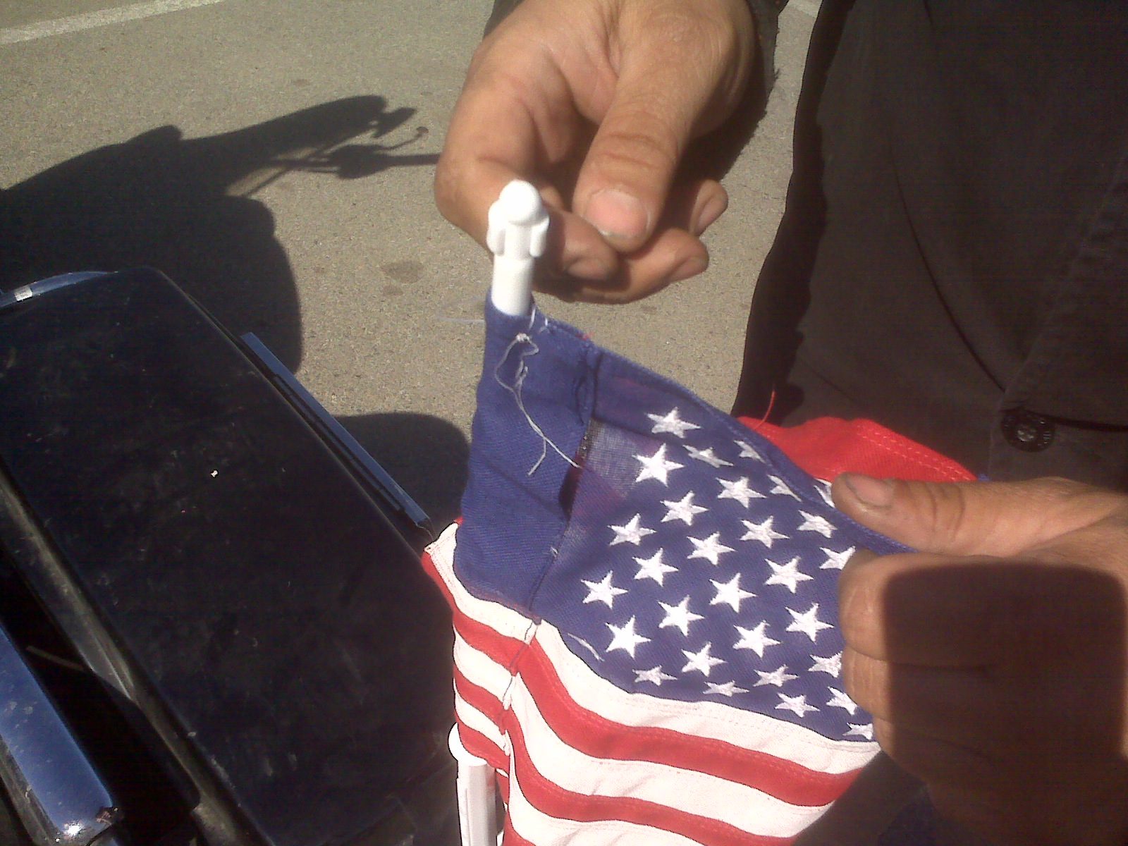 Ok, so I couldn’t find a damn flag anywhere. Went to all the stores you could think of until finally I got fed up and made on from a garden flag and a football team car flag pole.