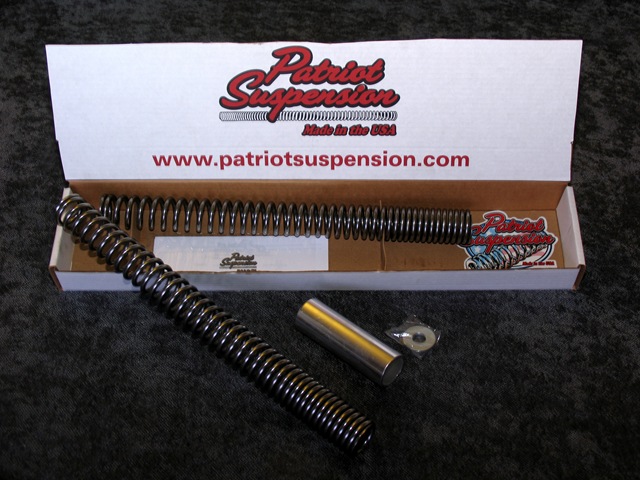 Multirate_Fork_Spring_kit__3[1] Owning  their own spring company, they are able to do research and development to improve suspension design without having to accept a partial solution. Their new Genisis Series Fork Spring kit is a unique design – two fork springs – one inside the other – into a single system engineered to offer a soft and compliant ride over most ordinary bumps in the road. But as the outer fork spring compresses due to rougher road conditions, the inner spring in each fork leg takes over to absorb the load force. Thus the “Soft Ride, No Dive.” These suspension kits are available for nearly every type of cruiser bike on the market. All Patriot Suspension products are proudly 100% MADE IN THE USA.