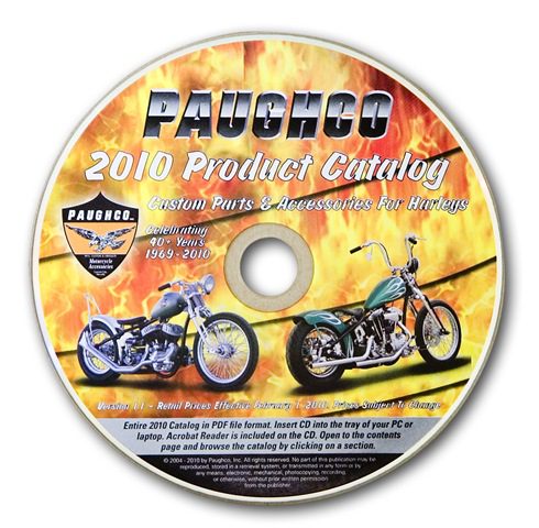 Paughco on Disc That’s right you can now receive the complete 2010 Paughco catalog on CD for just the cost of shipping and handling. This is no watered down version but the entire 325 plus page collection of the world’s oldest, most respected line of Chopper, Bobber and restoration parts. From the largest and most comprehensive line of Springer front ends, tanks, fenders, primaries, replacement wheels, exhaust, handlebars and related accessories to the unprecedented collection of custom and replacement frames, it’s all here on this single CD. And it’s FREE! All you pay is S&H of $2.95 each. To order yours visit Paughco on line at www.paughco.com or call direct to 775-246-5738